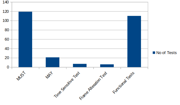 All the test case executions are not mandatory for compliance. There are 119 mandatory test cases that must be executed for compliance and 21 optional test cases. Following chart summarizes the category of test cases.